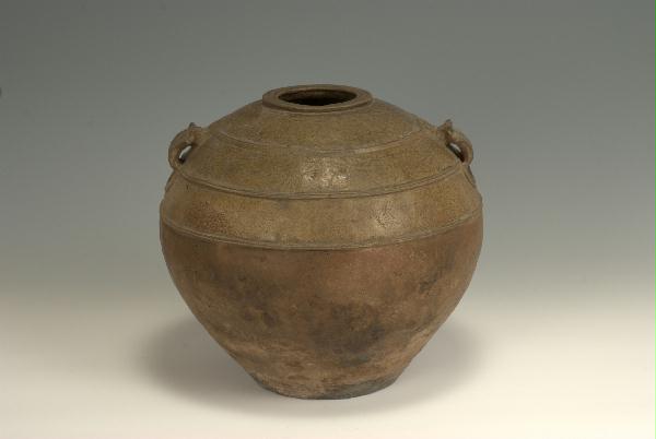 描述:汉代圆唇,剑口,鼓腹,凤耳,褚釉瓷酺