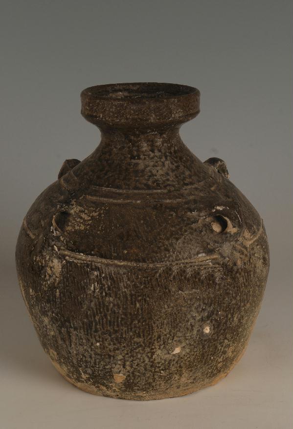 描述:盘口,短颈,溜肩,肩部有对称四系,颈腹间饰三条凹弦纹,曲腹,平底。通体施青褐色釉,釉面斑驳不均。