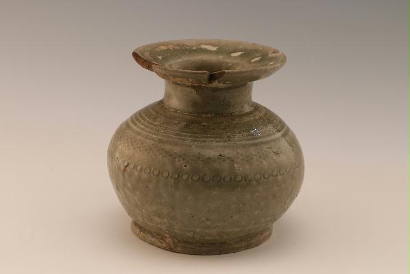 描述:敞口, 圆唇, 圆腹, 底内凹, 肩部饰弦纹、圆圈纹, 上腹部饰网格纹、圆圈纹。釉色呈青绿色,釉色晶莹。器形、釉质特点均符合早期越窑产品特点。