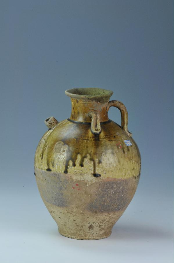 描述:喇叭口,短颈,鼓腹,平底,有鋬,鋬下部有洞。肩部对饰两附耳,流口短,六棱,釉不及底,内饰全釉,釉色黄中透绿。